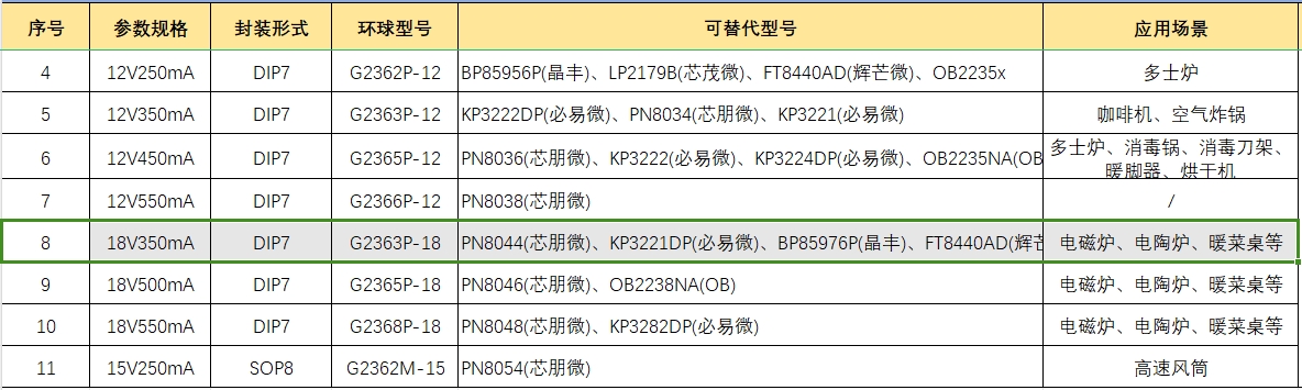 在電源管理領(lǐng)域,非隔離buck芯片扮演著至關(guān)重要的角色,尤其是在小家電市場(chǎng)中。G2363P-18作為一款高性能的非隔離buck芯片,以其18V350mA的輸出能力,廣泛應(yīng)用于電磁爐等設(shè)備。然而,在實(shí)際應(yīng)用中,工程師們可能會(huì)尋找替代型號(hào)以滿足特定的設(shè)計(jì)需求或成本考慮。以下是G2363P-18的一些可替代型號(hào)及其特點(diǎn)分析。