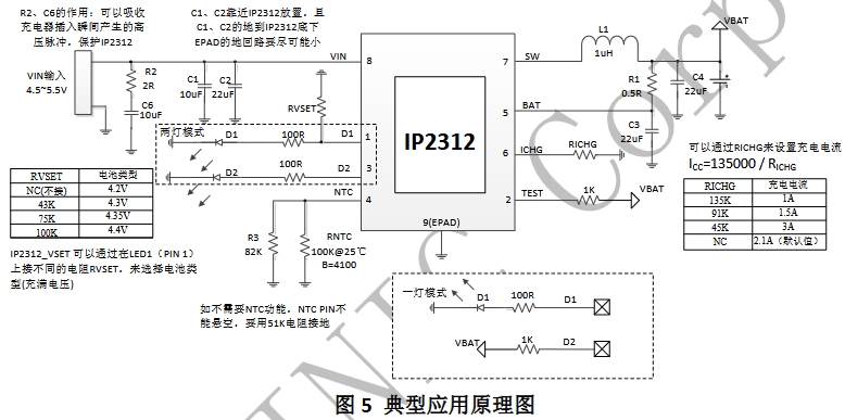 NTC(Negative Temperature Coefficient)熱敏電阻是一種隨溫度升高電阻值降低的元件,IP2312通過NTC引腳與NTC熱敏電阻相連,能夠?qū)崟r監(jiān)測電池的溫度變化,根據(jù)溫度的不同,調(diào)整充電策略,以確保充電過程的安全性和電池的健康。