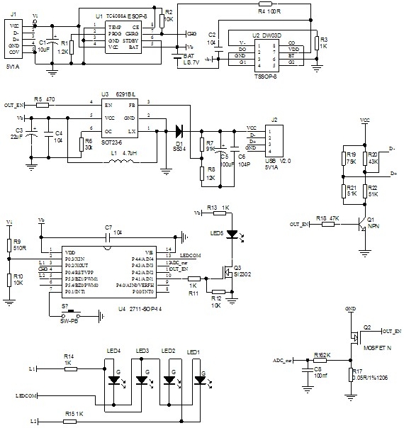 當(dāng)輸入電壓(交流適配器或 USB 電源)被拿掉時(shí),TC4056A 自動(dòng)進(jìn)入一個(gè)低電流狀態(tài),將電池漏電流降至2uA 以下。TC4056A 在有電源時(shí)也可置于停機(jī)模式,以而將供電電流降至 55uA。TC4056A 的其他特點(diǎn)包括電池溫度檢測(cè)、欠壓閉鎖、自動(dòng)再充電和兩個(gè)用于指示充電、結(jié)束的 LED 狀態(tài)引腳。