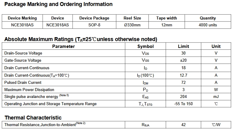 NCE3018AS采用先進(jìn)的溝槽技術(shù)和設(shè)計(jì),以低柵極電荷提供優(yōu)異的Rps(on),可用于多種應(yīng)用。