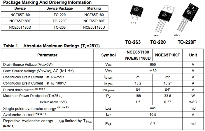 NCE65T180F新潔能TO-220F封裝650V 21A N溝道MOS管場效應(yīng)管