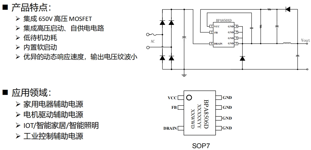 BPA8506D是一款集成了650V高壓MOSFET的高性能電源管理芯片,專為滿足家用電器、電機驅動、物聯網設備以及工業(yè)控制等領域的輔助電源需求而設計。它不僅具備高壓啟動和自供電功能,還實現了低待機功耗、優(yōu)異的動態(tài)響應速度以及低輸出電壓紋波等特性,極大地提升了電源系統的整體性能。