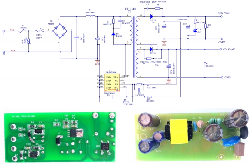 BPA8506D參考設計的電路圖和實物圖展示了其簡潔而高效的布局。通過合理選擇元件和優(yōu)化電路結構,該設計實現了高性能與高可靠性的平衡。例如,采用EE1310磁芯的變壓器,其初級繞組感量為950uH±7%,漏感量小于30uH,確保了高效的能量傳輸和穩(wěn)定的輸出電壓。此外,電路中還配備了多種保護機制,如短路保護、過流保護等,進一步提升了系統的安全性。