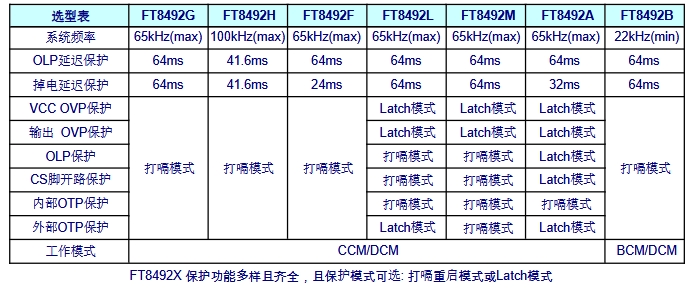 在保護功能方面,F(xiàn)T8492系列芯片提供了多種保護機制,且保護模式可選。例如,其過載保護(OLP)和輸出過壓保護(OVP)可選擇打嗝模式或Latch模式,以適應不同的應用場景和設計需求。打嗝模式在故障發(fā)生時會自動重啟芯片,而Latch模式則會鎖定故障狀態(tài),直到故障排除后重新啟動。這種靈活的保護模式選擇,為設計人員提供了更大的靈活性,能夠根據(jù)具體應用需求優(yōu)化保護策略。