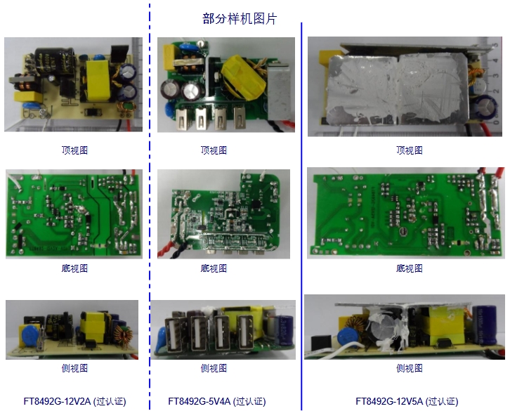 FT8492G作為該系列的典型型號,已經(jīng)成功應用于多種適配器設計中。例如,F(xiàn)T8492G-12V2A、FT8492G-5V4A和FT8492G-12V5A等樣機均已通過相關(guān)認證。這些樣機的性能表現(xiàn)優(yōu)異,不僅在效率上達到了DoE/CoC六級標準,還在實際使用中表現(xiàn)出良好的穩(wěn)定性和可靠性。