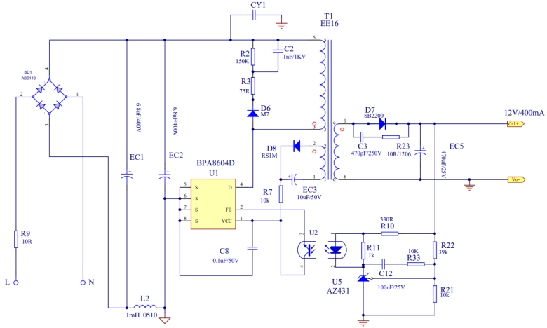 BPA8604D的電路設(shè)計簡潔而高效,充分體現(xiàn)了其高度集成化的特點。從電路圖中可以看出,整個電源電路主要由輸入濾波、整流橋、變壓器、反饋電路和輸出濾波等部分組成。輸入濾波部分采用了電解電容和貼片電容的組合,能夠有效濾除輸入電壓中的高頻噪聲,為后續(xù)電路提供穩(wěn)定的輸入電壓。