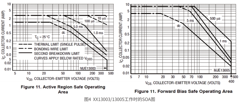 1.圖4為某款13003和13005工作在飽和區(qū)的SOA圖。