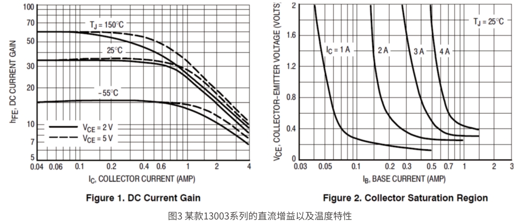 3.功率BJT的hFE是正溫特性,當(dāng)IC=0.7A左右的時候,高溫時會增加25%左右(如圖3所示),因此,溫度越高,同等驅(qū)動電流(芯片驅(qū)動電流接近零溫)情況下的VCE會越低,導(dǎo)通損耗越小。