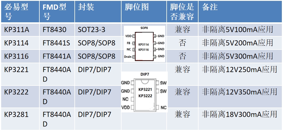 必易微的KP3221和KP3222型號與FT8440AD在封裝和腳位上兼容。KP3221是非隔離12V250mA應(yīng)用,KP3222是非隔離12V350mA應(yīng)用,F(xiàn)T8440AD能夠完美替代這兩款型號,為用戶提供更加高效和可靠的電源解決方案。
