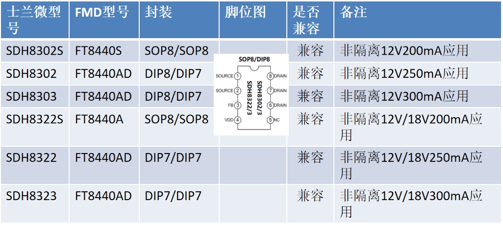 士蘭微的SDH8302S、SDH8302、SDH8303、SDH8322S、SDH8322和SDH8323型號與FT8440系列芯片在封裝和腳位上兼容。這些型號涵蓋了非隔離12V200mA、12V250mA、12V300mA以及12V/18V200mA、12V/18V250mA、12V/18V300mA等多種應(yīng)用,F(xiàn)T8440系列芯片能夠全面替代這些型號,滿足不同用戶的需求。