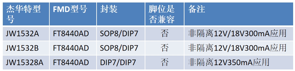 杰華特的JW1532A、JW1532B和JW15328A型號與FT8440AD在功能和性能上具有相似性。這些型號涵蓋了非隔離12V/18V300mA和12V350mA等多種應(yīng)用,F(xiàn)T8440AD能夠替代這些型號,為用戶提供更加高效和可靠的電源解決方案。