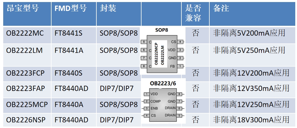 昂寶的OB2223FCP和OB2223FAP型號與FT8440S和FT8440AD在功能和性能上具有相似性。雖然在封裝和腳位上不完全兼容,但通過簡單的電路調(diào)整,F(xiàn)T8440系列芯片可以替代這兩款型號,為用戶提供更加高效和可靠的電源解決方案。