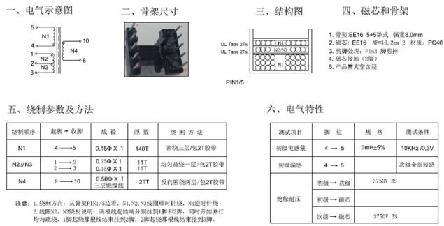 變壓器作為電源適配器中的關鍵部件,其性能直接影響電源轉換效率與輸出穩(wěn)定性。該適配器采用 EE16 型號的變壓器,初級與次級繞組匝數比為 140:21,電感量設定為 2mH,磁芯有效截面積為 19.2mm2。