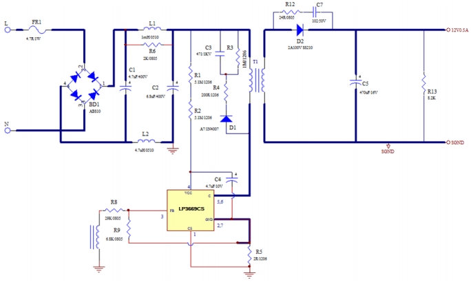 在現(xiàn)代電子設備中,電源適配器作為核心的供電組件,其性能的優(yōu)劣直接關系到設備的穩(wěn)定運行與使用壽命。本文將對一款基于 LP3669CS 控制芯片與 SS210 二極管設計的 12V0.5A 電源適配器進行深入分析,涵蓋其原理圖解析、電路板實物展示以及關鍵變壓器資料解讀,全方位呈現(xiàn)該適配器的設計理念與實際性能表現(xiàn)。