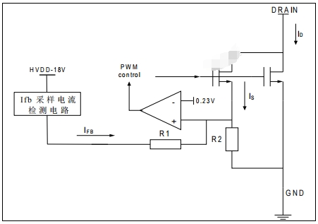 通過高壓 MOS 的電流 ID分成兩個部分,其中一部分為 IS,這部分電流為芯片采樣電流。IS與 ID成比例關系: