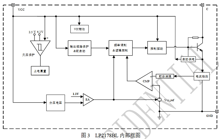 LP2178BL的啟動過程非常簡潔。芯片僅需1uA的啟動電流,系統(tǒng)上電后,通過內(nèi)部啟動供電電路對VCC的電容進(jìn)行充電。當(dāng)VCC電壓達(dá)到芯片開啟閾值時(shí),內(nèi)部控制電路開始工作,輸出電壓開始上升并建立。在輸出電壓穩(wěn)定后,VCC由輸出電壓供電,確保系統(tǒng)的持續(xù)運(yùn)行。