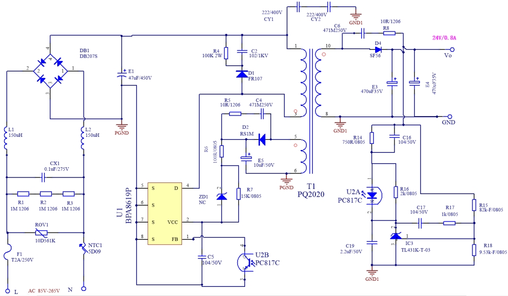 開關(guān)變換電路的核心是 BPA8619P 芯片,它通過內(nèi)部的 MOSFET 開關(guān)管在高頻條件下對輸入直流電壓進行斬波,然后通過變壓器 T1 將能量傳遞到副邊。反饋控制電路由光耦 PC817C 和 TL431 等元件組成,用于檢測輸出電壓的變化,并將其反饋到 BPA8619P 芯片的反饋引腳,從而實現(xiàn)對開關(guān)頻率和占空比的動態(tài)調(diào)整,確保輸出電壓的穩(wěn)定。
