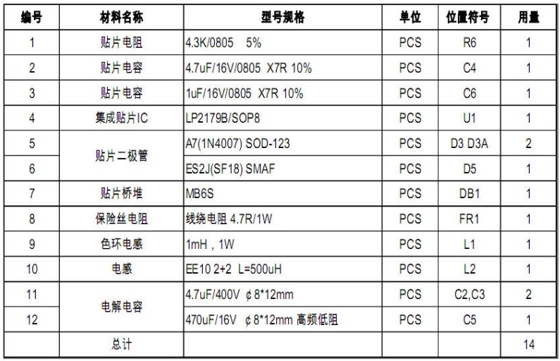 該電源方案的 BOM 表詳細(xì)列出了所需的各種元件及其規(guī)格和用量。其中包括貼片電阻、貼片電容、集成貼片 IC、貼片二極管、貼片橋堆、保險(xiǎn)絲電阻、色環(huán)電感、電感、電解電容等。這些元件均為高品質(zhì)的電子元件,能夠確保電源的穩(wěn)定性和可靠性。通過(guò)合理的元件選擇和用量控制,該方案在保證性能的同時(shí),也具有較高的性價(jià)比。
