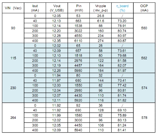測(cè)試報(bào)告詳細(xì)記錄了該電源方案的各項(xiàng)測(cè)試數(shù)據(jù)和結(jié)果。在紋波、調(diào)節(jié)和效率測(cè)試中,其紋波電壓在不同輸入電壓和負(fù)載條件下均能夠保持在較低水平,表現(xiàn)出良好的輸出穩(wěn)定性。在效率方面,隨著輸入電壓的升高和負(fù)載的增加,其效率也相應(yīng)提高,最高可達(dá) 82.07%,顯示出較高的能量轉(zhuǎn)換效率。