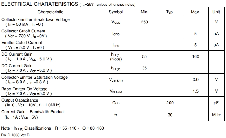 集電極 - 發(fā)射極飽和電壓(VCE(SAT)):在集電極電流為8.0A,基極電流為0.8A時,VCE(SAT)的最大值為3.0V。較低的飽和電壓意味著在晶體管導(dǎo)通時,能量損耗較小,從而提高了功率放大器的效率。