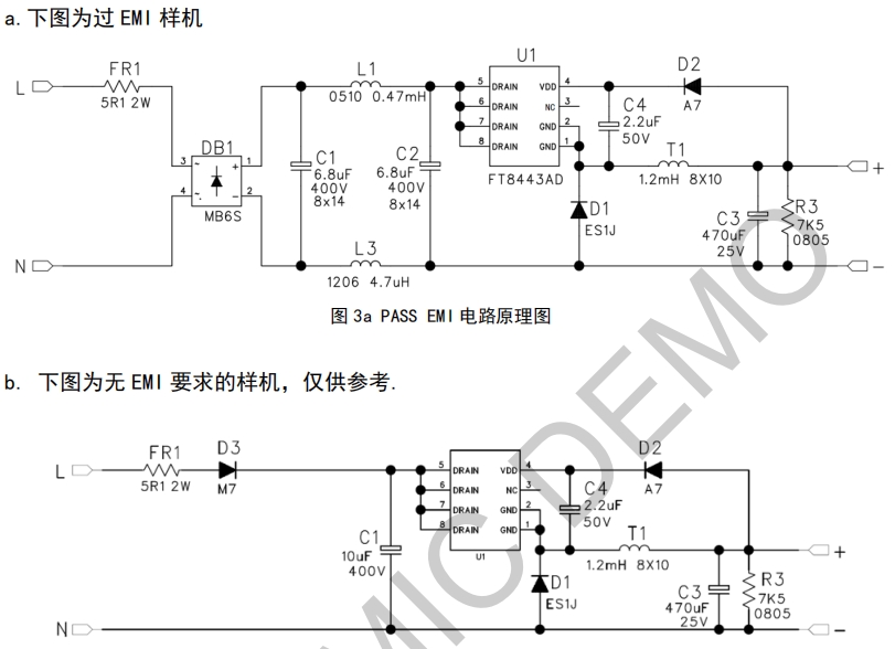 FT8443AD內(nèi)置650V高壓MOS,使得IC在工作過程中溫度較低,進(jìn)一步提升了電源的可靠性。同時(shí),該方案還具備過壓、欠壓、過溫、過流以及輸出短路保護(hù)等多種保護(hù)功能,全方位保障電源的安全運(yùn)行,延長(zhǎng)電源的使用壽命。