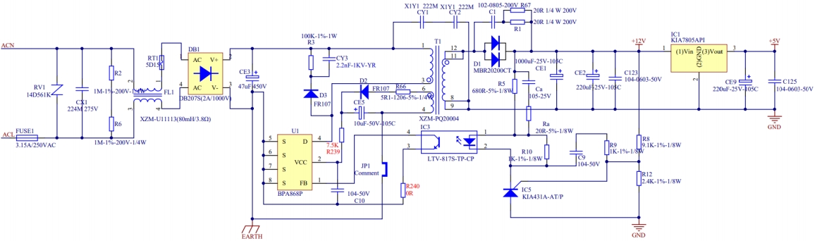 在主電路部分,BPA861AP芯片通過(guò)集成的高壓MOSFET實(shí)現(xiàn)開(kāi)關(guān)功能,將輸入的交流電轉(zhuǎn)換為高頻脈沖信號(hào),再經(jīng)過(guò)變壓器進(jìn)行隔離和降壓,最終通過(guò)整流濾波電路輸出穩(wěn)定的12V直流電壓。光耦和TL431組成的反饋電路能夠?qū)崟r(shí)監(jiān)測(cè)輸出電壓的變化,并將反饋信號(hào)傳遞給BPA861AP芯片,從而實(shí)現(xiàn)對(duì)輸出電壓的精確調(diào)節(jié)。