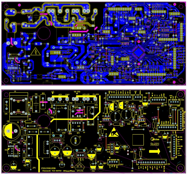 在布線方面,電源輸入端和輸出端的走線盡量加粗,以降低線路阻抗,減少電壓降。同時(shí),高頻信號(hào)線和敏感信號(hào)線之間保持足夠的間距,避免信號(hào)干擾。此外,PCB還設(shè)置了足夠的接地平面,以提高電源的抗干擾能力。