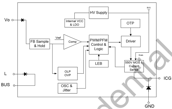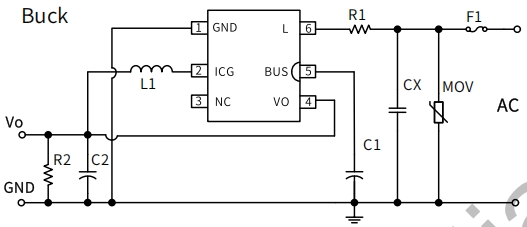 ICG(管腳 2):芯片地,同時也是內(nèi)置 MOSFET 的源極和內(nèi)置續(xù)流二極管的陰極。該管腳為芯片的內(nèi)部控制電路提供了接地參考點,并確保 MOSFET 能夠正常導(dǎo)通和關(guān)斷。