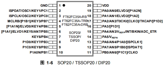 FT62FC6X系列微控制器根據(jù)不同的封裝類(lèi)型和功能需求,提供了多種引腳配置。以下是結(jié)構(gòu)框圖及一些常見(jiàn)的引腳及其功能介紹: