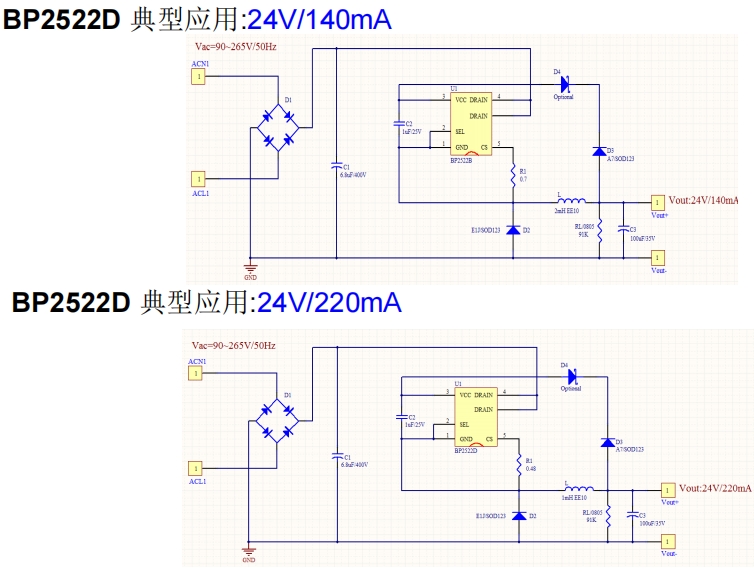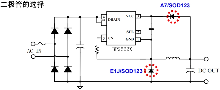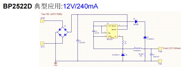 以BP2522D為例,持續(xù)輸出240mA,脈沖350mA,電感量為470uH,電感電流紋波為57mA。最大峰值電流為579mA,BP2522D內(nèi)部MOS管限制最大電流為750mA,留有一定余量,可取Rcs=0.3ohm。