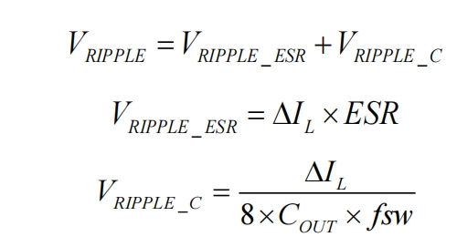 輸出電容的選擇對(duì)輸出電壓紋波、系統(tǒng)動(dòng)態(tài)響應(yīng)、環(huán)路穩(wěn)定性、輸出電壓過(guò)沖等有直接影響。在恒定輸出電流的CV模式下,輸出紋波主要由輸出電容的等效串聯(lián)電阻(ESR)和容量決定。紋波計(jì)算公式為: