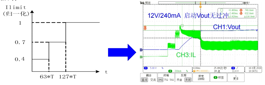 BP2522D具備軟啟動(dòng)功能,通過(guò)分段增加峰值電流來(lái)減小開(kāi)關(guān)應(yīng)力,避免輸出電壓過(guò)沖現(xiàn)象。軟啟動(dòng)分為三個(gè)階段:第一階段Ipk1=0.4Ilimit,第二階段Ipk2=0.7Ilimit,第三階段Ipk3等于設(shè)置的Ilimit。在重載下啟動(dòng)時(shí),系統(tǒng)會(huì)觸發(fā)降頻模式,工作頻率降為滿載的1/4。