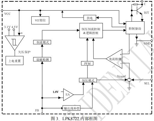 LPK8727僅需1uA的啟動電流。系統(tǒng)上電后,通過內(nèi)部啟動電路給Vcc的電容充電,當(dāng)Vcc電壓達到芯片開啟閾值時,芯片內(nèi)部控制電路開始工作。系統(tǒng)啟動后,Vcc由內(nèi)部專有的供電電路進行供電。