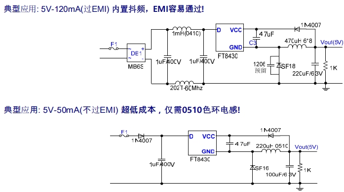 在該電路中,F(xiàn)T8430通過一個470uH的工字電感和一個1uF/400V的電容實(shí)現(xiàn)5V-120mA的輸出。該電路具有內(nèi)置抖頻功能,能夠輕松通過EMI測試,適用于需要高精度電壓和低待機(jī)功耗的小家電設(shè)備,如智能插座、智能照明設(shè)備等。