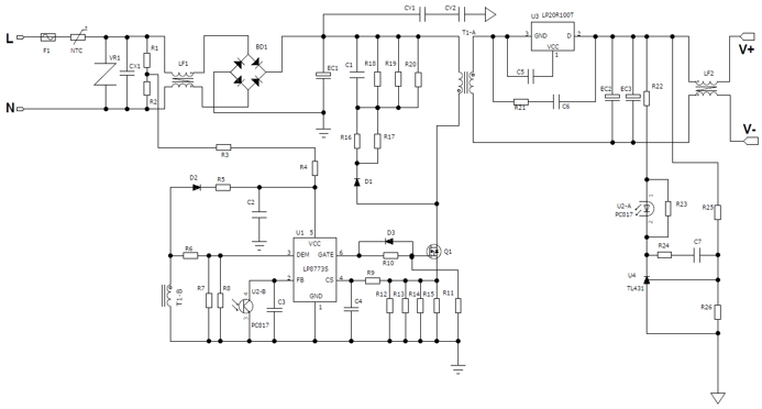 原邊電路:LP8773S直接驅(qū)動MOSFET,無需光耦反饋,節(jié)省1顆光耦+TL431。