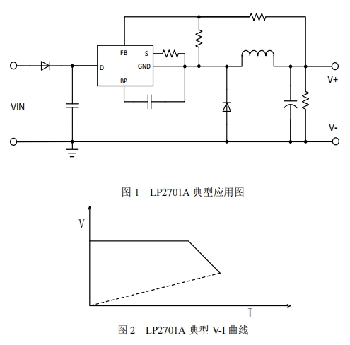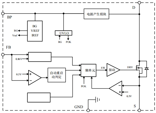集成500V高壓功率管,無需外部啟動電阻和輔助繞組供電,簡化外圍電路;