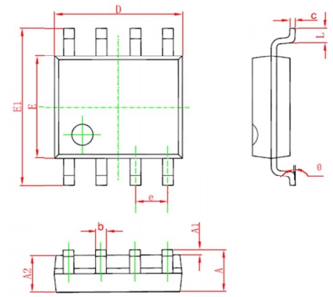 FT8395MBB和FT8395MDB在90~264Vac輸入電壓范圍內(nèi),典型功率可達18W,適用于多種功率要求的適配器電源。芯片采用SOP8封裝,封裝外形尺寸小巧,便于在緊湊的電源適配器內(nèi)部進行安裝和散熱設(shè)計。封裝尺寸如下: