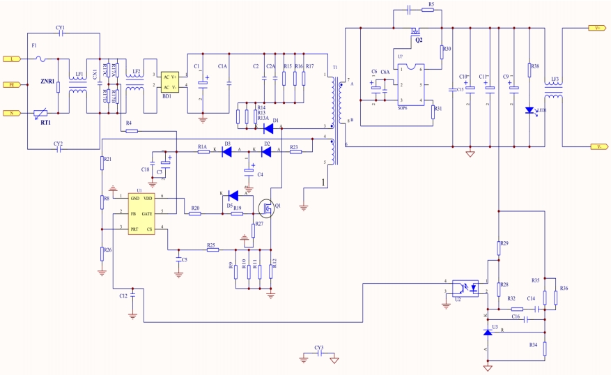 LP8773:作為主控芯片,LP8773內(nèi)部集成了PWM控制器、高壓?jiǎn)?dòng)電路、過壓保護(hù)、過流保護(hù)等多種功能,確保了電源的穩(wěn)定運(yùn)行。
