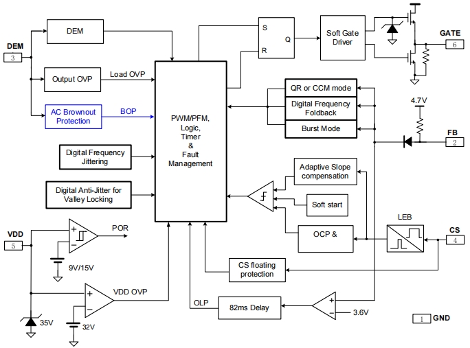 軟啟動(dòng)功能:內(nèi)置4ms的軟啟動(dòng)時(shí)間,逐周期增大CS電流限閾值,有效降低了變壓器磁飽和的風(fēng)險(xiǎn),同時(shí)減少了次級(jí)二極管在啟動(dòng)時(shí)所受的應(yīng)力。