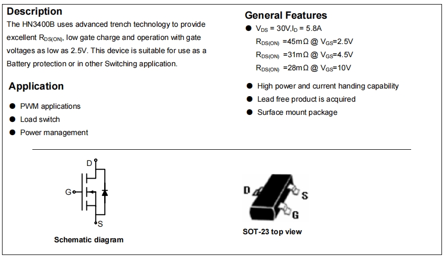 HN3400:低壓驅(qū)動最友好(2.5 V 即可 35 mΩ),適合單節(jié)鋰電池保護。