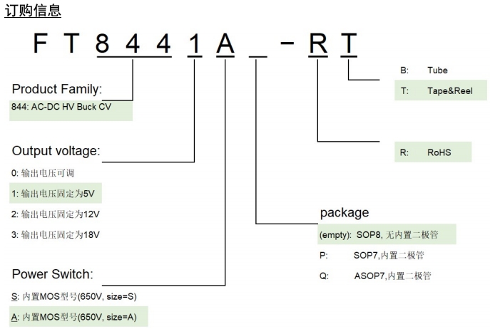 FT8441S:適用于 Buck 結(jié)構(gòu),持續(xù)輸出電流為 250mA,封裝形式為 SOP8。