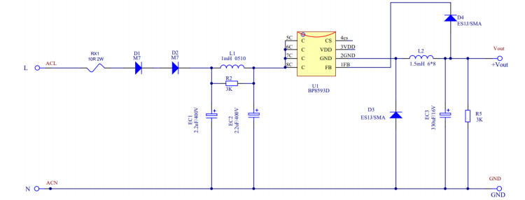 在智能家居、小家電、MCU待機供電等超小功率場景中,非隔離輔助電源因成本低、體積小、設計簡單而備受青睞。過去,OB2222E曾是這類100mA級方案的主流選擇,但受限于交期、價格及EMI裕量,工程師急需一顆直接替換、性能更優(yōu)的新品。BP8593D以 SOP7封裝、內置700V MOS、PSR架構、<100mW待機功耗為核心賣點,官方參考設計5V/100mA已完整驗證,BOM、PCB、測試數(shù)據一步到位,可實現(xiàn)零調試替代OB2222E。本文帶你一圖看懂這顆“小鋼炮”。