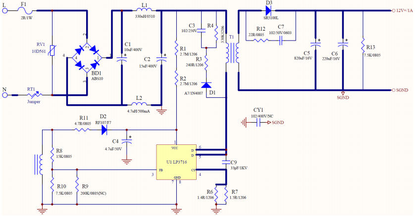 官方參考設計 LP3716+SB5100L 實測 83.3% 效率、<75mW 待機、12V±0.5% 精度,堪稱小功率適配器“極簡派”代表作。