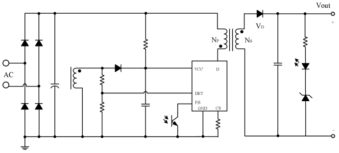 采樣鏈:DET 腳“一箭三雕”——退磁檢測(cè)、母線(xiàn)欠壓、輸出過(guò)壓;CS 腳做峰值電流;FB 腳收光耦。