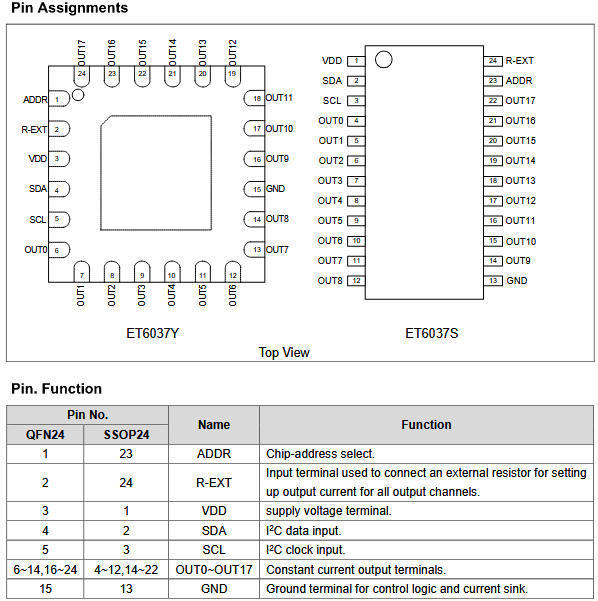 ET6037S 把「18 路恒流源 + 128 級(jí) PWM + I2C 四地址 + RGB 分組」?jié)饪s進(jìn) 4×4mm 的 QFN24 或 SSOP24: