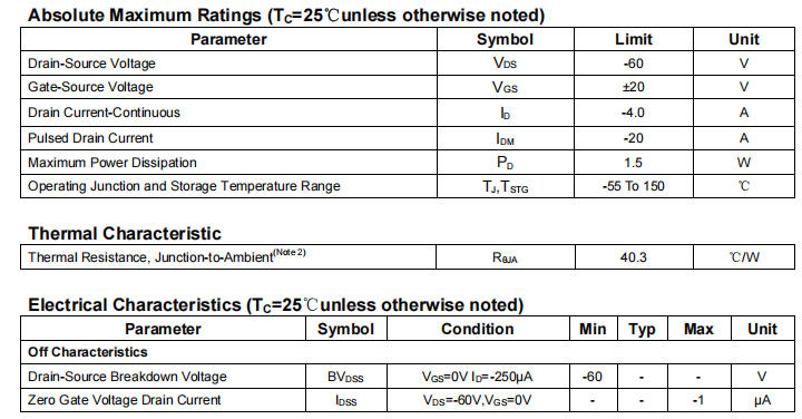 耐壓等級:VDS = -60V(P溝道器件電壓為負(fù)值)