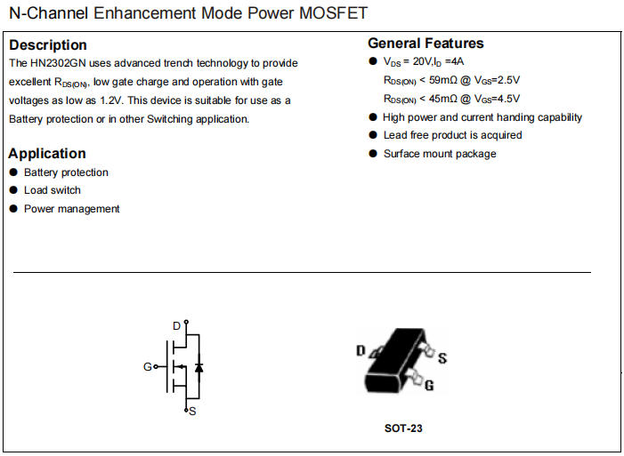 | HN2302GN | 華能 | 45mΩ | 0.5-1.2V | 國產(chǎn)低價,1.2V驅(qū)動 |