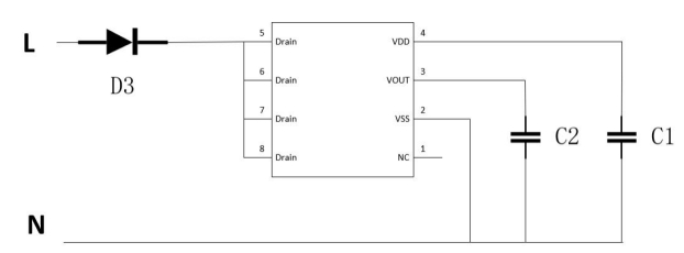 交流火線經(jīng)過整流二極管(半波)或橋堆(全波)整流后,連接到芯片的Drain腳。芯片內(nèi)部通過專利控制方式,在交流過零點(diǎn)附近開啟MOSFET給VDD電容充電儲能,再通過內(nèi)部LDO穩(wěn)壓輸出5V。VOUT腳直接輸出穩(wěn)定的5V電壓,給后級單片機(jī)、傳感器等供電。