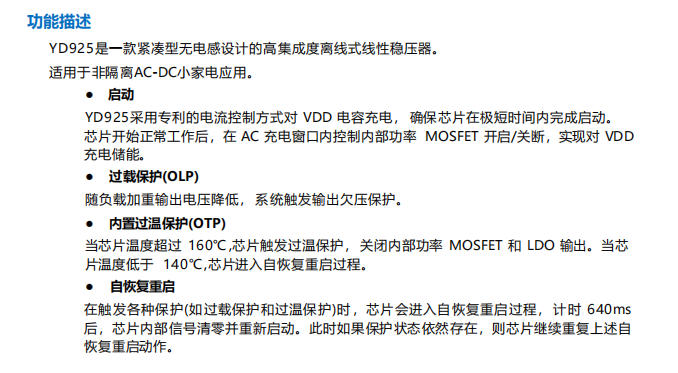 YD925是阻容降壓方案的理想替代品,用一顆芯片替代了高壓電容、限流電阻、穩(wěn)壓管等多個元件,外圍極簡、成本更低、可靠性更高。對于5V/30mA級別的小功率供電需求,如小家電控制板、智能燈具等應(yīng)用,YD925是性價比最優(yōu)的選擇。