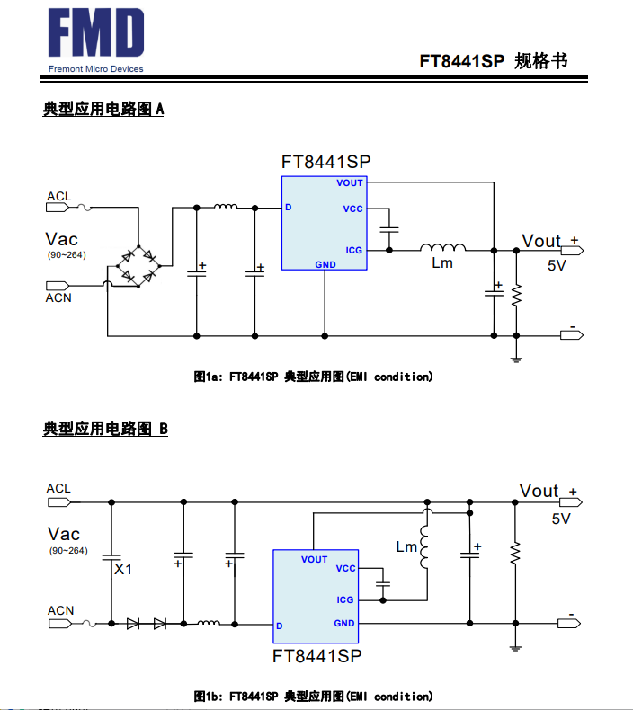 FT8441SP還集成了其他功能:VCC欠壓保護(hù)(UVLO)、VCC欠壓保護(hù)(UVLO)、VCC過壓保護(hù)(OVP)、過溫保護(hù)(OTP)、逐周期過流保護(hù)(OCP)、輸出短路保護(hù)(SCP),從而保證了系統(tǒng)的可靠性。